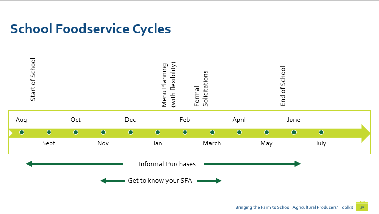 As a producer, it’s important to understand the unique timing of School Food Authority planning and procurement to best work with School Food Authorities. As you are learning, all child nutrition programs are different, but here are some general school food service trends: