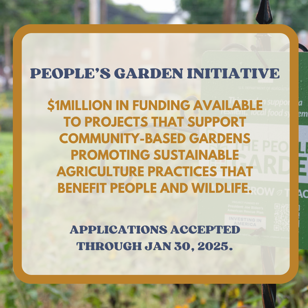 Approximately $1 million in funding is available from the People’s Garden Initiative through USDA’s Office of Urban Agriculture and Innovative Production, in partnership with The National Fish and Wildlife Foundation’s (NFWF) 2025 Five Star and Urban Waters Restoration program. The program will fund projects that support community-based gardens promoting sustainable agriculture practices that benefit people and wildlife.